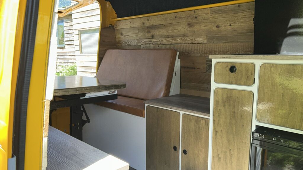 De bus heeft een klein keukentje met alle gemakken voorzien. Koelkast essentieel voor je gekoelde biertje of wijntje, maar ook een gaspitje en een gootsteen zijn aanwezig.