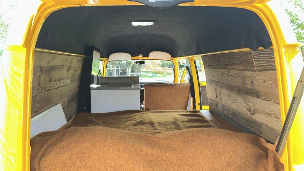 Je kunt achterin met 2 personen zitten; klap gerust de achterklep open om zo nog meer van de natuur om je heen te genieten. Deze plek verander je gemakkelijk tot je bed waarbij je de zonsopkomst vanuit je bedje niet kan missen.